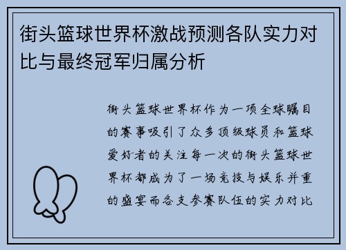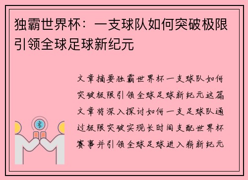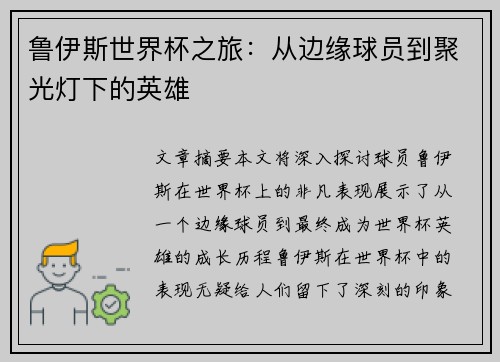 文章摘要:邵圣懿作为体育评论员和主持人,凭借其独特的视角和深入的分析,成功地带领观众走进世界杯赛场的背后。本文将围绕邵圣懿对世界杯赛场的全面解读展开,从多个维度分析其如何通过精彩瞬间与背后的故事展现赛事的魅力。文章将从比赛背后的数据分析、球员心理状态、战术演变、以及世界杯的社会影响等四个方面详细探讨...