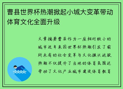 曹县世界杯热潮掀起小城大变革带动体育文化全面升级
