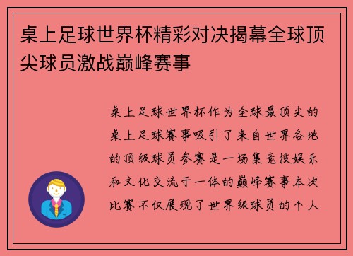 桌上足球世界杯精彩对决揭幕全球顶尖球员激战巅峰赛事